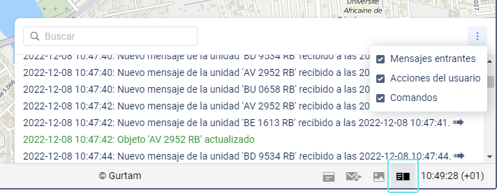 en la barra de herramientas inferior. El historial muestra la información sobre las acciones del usuario, ejecución de comandos y recepción de mensajes de las unidades presentes en la lista de trabajo de la pestaña Seguimiento.