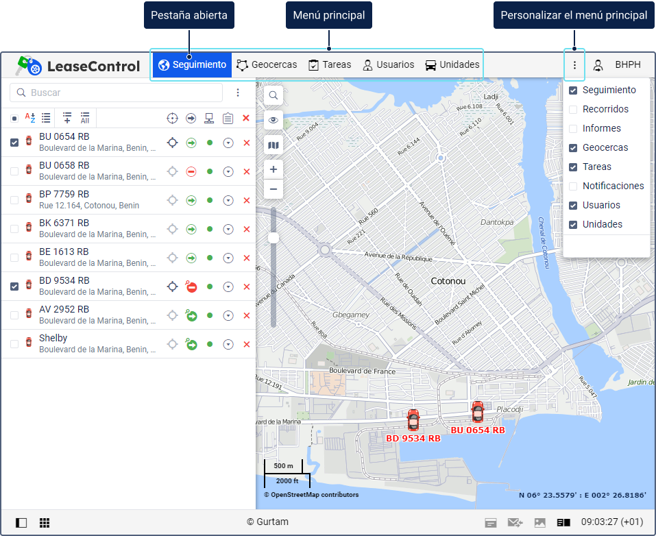 Unidades: la gestión de las unidades de seguimiento disponibles.