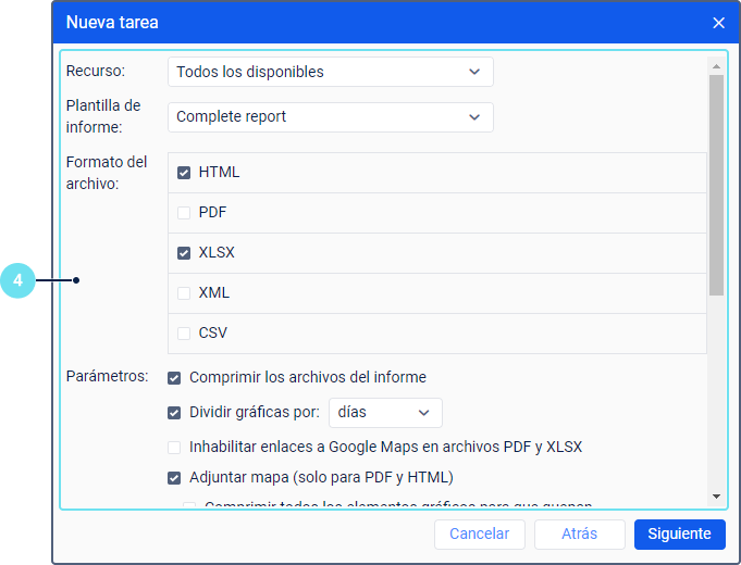 - Seleccione una o varias unidades para las que quiere crear la tarea. Para la tarea Enviar un informe por email, se puede escoger otros objetos (usuarios, recursos, etc.) en función del tipo del informe.