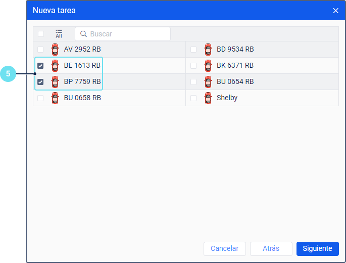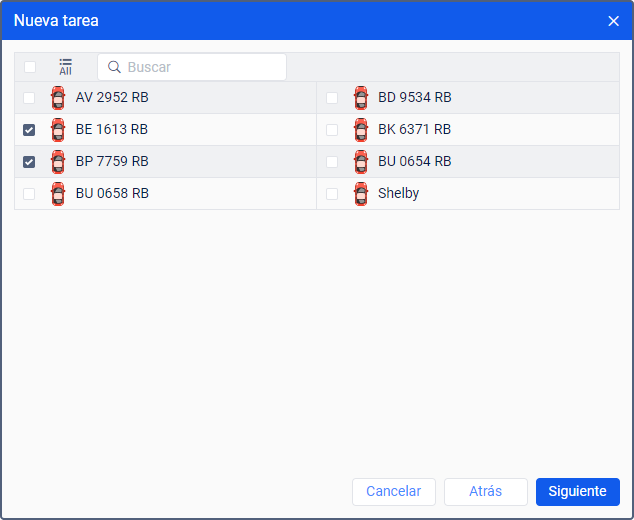 Para seleccionar unidades y grupos para los que quiere crear una tarea, márquelos en la lista. Para seleccionar todos los elementos a la vez, marque cualquiera de ellos manteniendo apretada la tecla Ctrl o marque la casilla en el encabezado de la tabla.