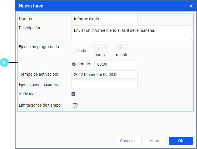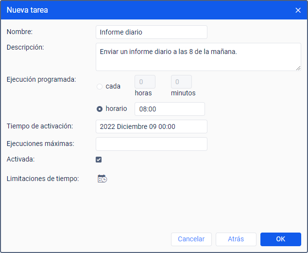 | Ejecuciones máximas | Cantidad máxima de ejecuciones al alcanzar la cual la tarea se desactiva automáticamente. Si este campo no está llenado, la tarea se ejecuta hasta que sea eliminada o desactivada manualmente. |