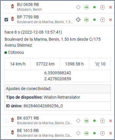 Además de la descripción emergente, se puede recibir información adicional sobre una unidad al apretar su icono en la lista de trabajo de la pestaña Seguimiento (tanto en el modo de unidades, como en el modo de grupos de unidades). Su contenido también se ajusta en los parámetros del usuario.
