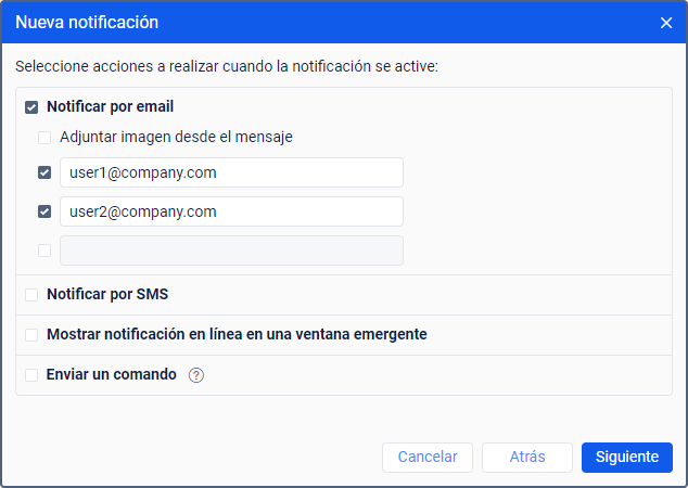 Este modo de acción permite configurar el envío de notificaciones por correo electrónico. Para ello, marque la casilla al lado del campo y escriba la dirección de correo electrónico para recibir las notificaciones. Al finalizar, un nuevo campo se agrega automáticamente. Para cancelar el envío de la notificación a alguna dirección, quite la marca de la casilla a su lado.
