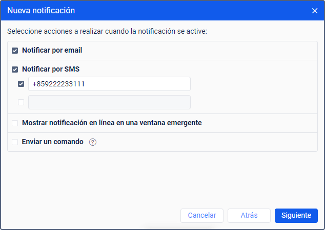 Este modo de acción permite configurar el envío de notificaciones como mensajes de texto SMS. Está disponible solo cuando la opción Puede enviar SMS está activada en las propiedades del usuario. Los números de teléfono se indican en el formato internacional (por ejemplo, +34936940617). Al finalizar cada entrada, un nuevo campo se agrega automáticamente.