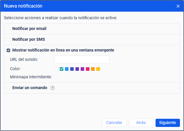 Este modo de acción permite mostrar notificaciones en una ventana emergente en LeaseControl (vea más detalles). Si en los parámetros del usuario está activada la opción Reproducir sonido para eventos, las notificaciones van acompañadas de un sonido. En el campo URL del sonido, puede indicar la dirección del sonido. El tamaño recomendado del archivo de sonido es hasta 0.5 megabytes. Si deja el campo en blanco, se utiliza el sonido por defecto.