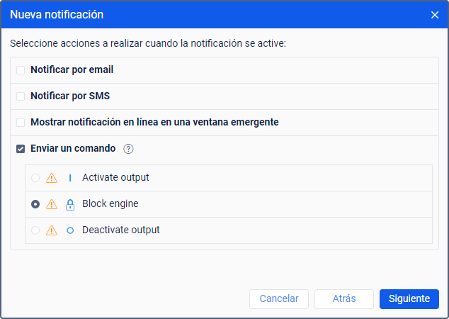 Este modo de acción permite enviar un comando determinado a una unidad (unidades). La lista contiene todos los comandos disponibles creados en las propiedades de todas las unidades seleccionadas si tiene el derecho de acceso Enviar comandos a estas unidades. A la izquierda del nombre de cada comando, se pueden mostrar los siguientes iconos: