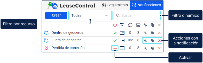 La pestaña contiene una lista de todas las notificaciones disponibles. Encima de la lista, se encuentran un botón para crear notificaciones, filtro de notificaciones por recurso y filtro dinámico.