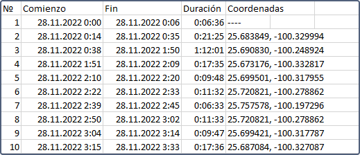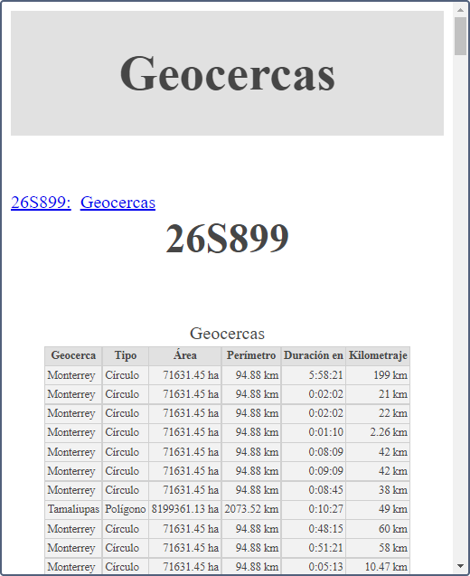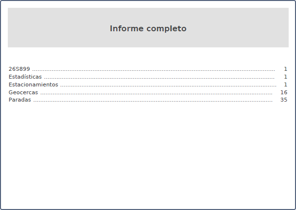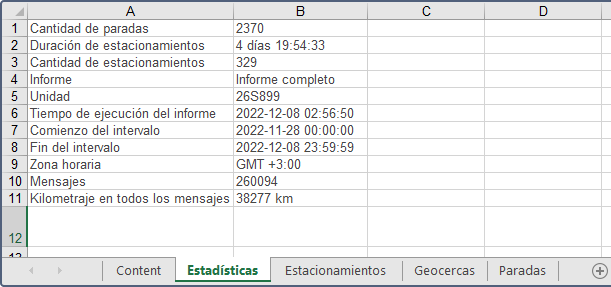 Al exportar el informe a archivos PDF, HTML y Excel, el texto en las columnas se alinea de forma automática. En las columnas de texto (nombres de sensores, comandos, geocercas, usuarios, ubicación de la unidad, etc.), se aplica la alineación izquierda. En las columnas de números (tiempo, duración, velocidad, kilometraje, cantidad, etc.), se aplica la alineación derecha. Los nombres de tablas y de columnas de tablas se centran.