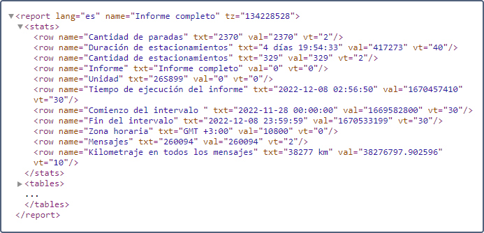 Si selecciona el formato XML, el informe se guarda como un archivo de texto con datos estructurados. El archivo de este formato puede utilizarse en sistemas externos.