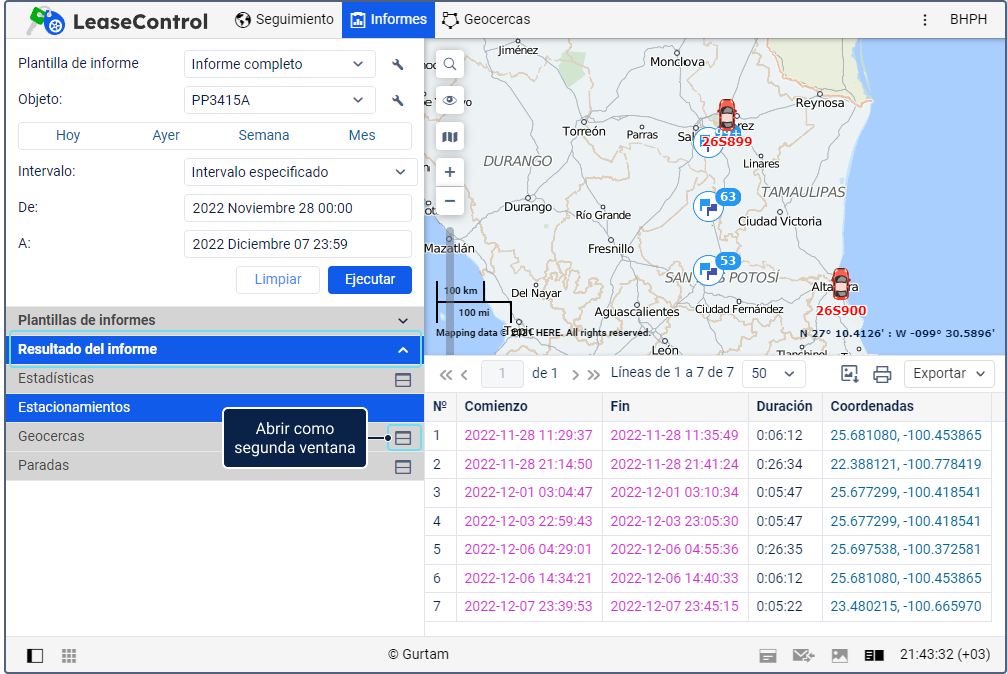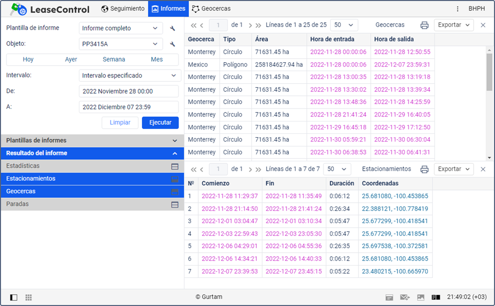 Si hay datos de la unidad que corresponden al intervalo del informe, después de hacer clic en Ejecutar, debajo de la sección Plantillas de informes se muestra una sección más, Resultado del informe.