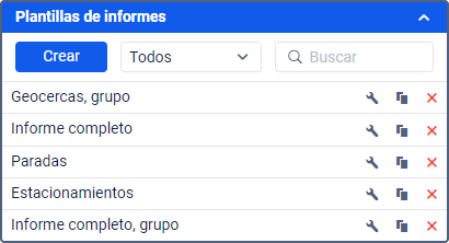 Un informe puede generarse solo a base de una plantilla creada de antemano. La lista de todas las plantillas disponibles está en la parte izquierda inferior en la pestaña Informes. Aquí se puede crear, modificar, copiar y eliminar plantillas de informes.