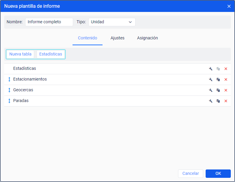 En la pestaña Contenido se puede agregar a la plantilla del informe tablas o datos de estadísticas.