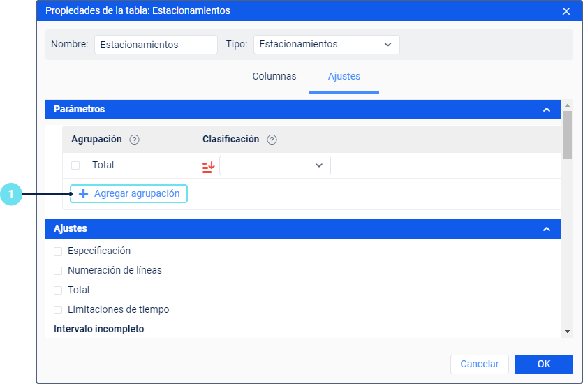 De los intervalos temporales disponibles (año, mes, semana, día de la semana, día del mes, estación, fecha, turno) se escogen los intervalos, según los cuales hay que agrupar los datos de la tabla. La agrupación puede ser tanto de un nivel, como de varios. Si es de varios niveles, es decir, si hay unas agrupaciones por diferentes intervalos, hay que configurar su jerarquía. Por ejemplo, una agrupación puede ser así: los datos tabulares están unidos por años, dentro de cada año — por meses y dentro de los meses — por días. La jerarquización se ajusta por medio de arrastrar los intervalos de la columna Agrupación hacia arriba o abajo — el elemento que está más arriba en la lista incluirá los de abajo.