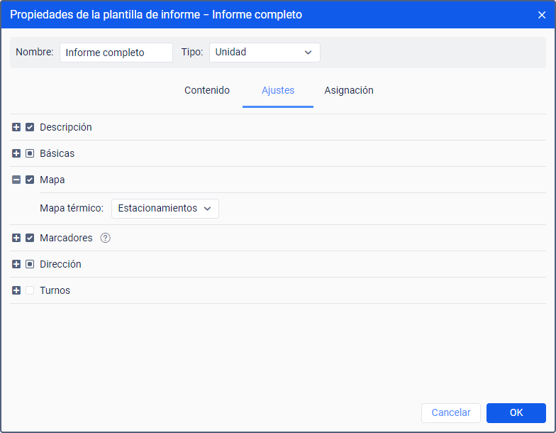 En informes pueden usarse marcadores para indicar en el mapa lugares de paradas y estacionamientos.