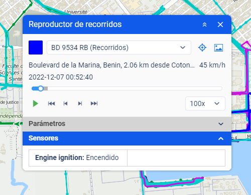 En las secciones de abajo se muestran los cambios de los valores de parámetros y sensores (solo sensores visibles). Despliegue estas secciones para ver su contenido completo. Si desea seguir solo parámetros y sensores determinados, puede trasladarlos a la sección principal del reproductor de recorridos. Para esto, haga un clic doble en el elemento necesario.