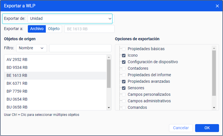 Para exportar propiedades de la unidad, seleccione en el menú el punto Exportar a WLP y, en la ventana que se ha abierto, indique Unidad en el campo Exportar de. Vea la guía detallada aquí.