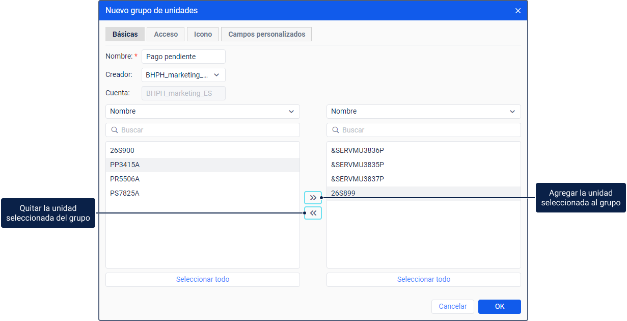 | Unidades | En la lista izquierda se muestran todas las unidades disponibles, en la lista derecha, las que ya se han agregado al grupo.Para cambiar el número de unidades agregadas al grupo, a este se requiere el acceso total. Para encontrar unidades por nombre rápidamente, utilice el filtro dinámico. Para buscar por otras propiedades de la unidad (por ejemplo, ID único, tipo de dispositivo, etc.), escoja la opción correspondiente en la lista desplegable encima de la búsqueda. Para agregar una unidad al grupo, muévala de la lista izquierda a la derecha; para quitar, haga lo contrario. Para mover unidades, utilice los iconos / o haga doble clic en las unidades seleccionadas.Para seleccionar varias unidades, mantenga presionada la tecla Ctrl y seleccione las unidades necesarias. Para seleccionar todas las unidades en la lista a la vez, apriete Seleccionar todo. |