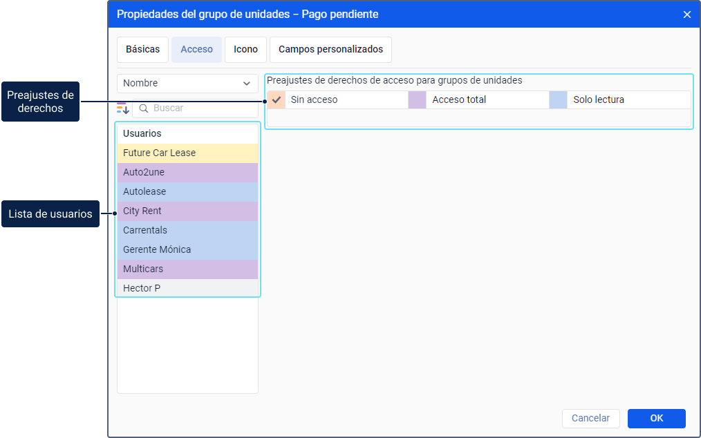 Para trabajar con esta pestaña, se requieren el acceso total al grupo de unidad y al usuario.