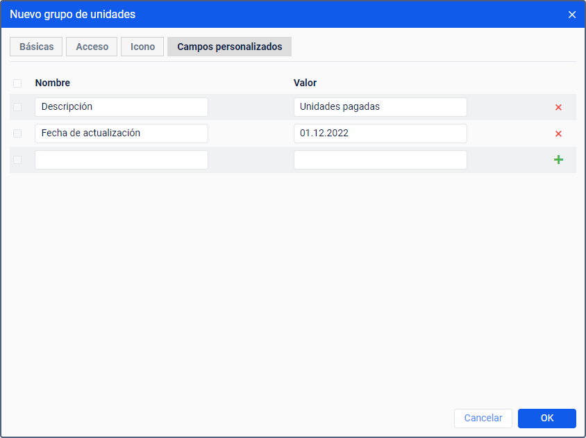 En la pestaña se puede crear campos personalizados con información adicional sobre el grupo o las unidades que se han agregado a la misma.