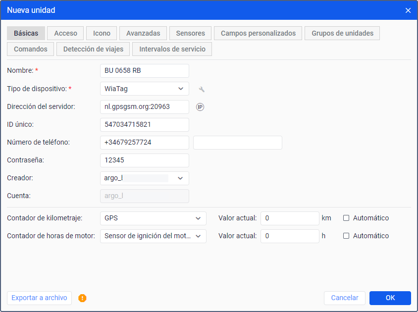 La ventana de propiedades de unidad se muestra al crear, modificar y copiar una unidad. En la ventana, puede indicar diferentes parámetros de la unidad, configurar acceso a la misma, crear sensores, etc.