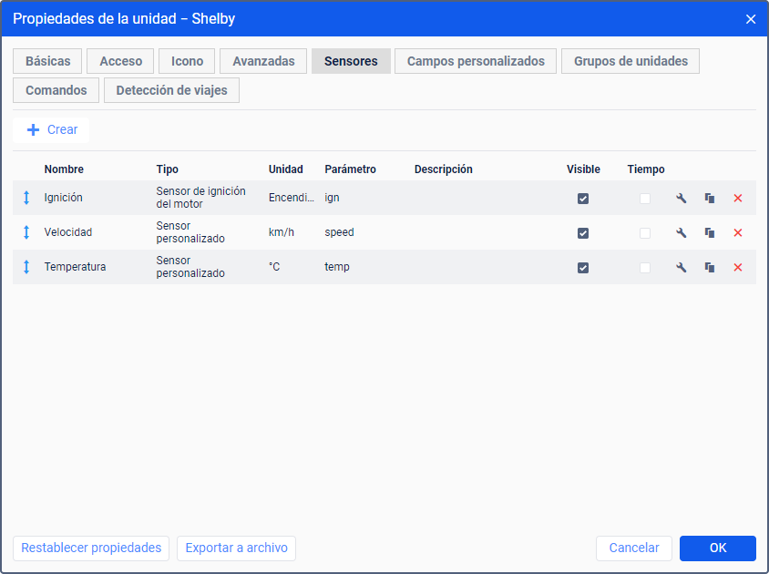 En esta pestaña puede crear, copiar y eliminar sensores de la unidad, configurar sus propiedades, visibilidad y orden.