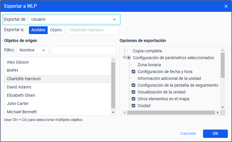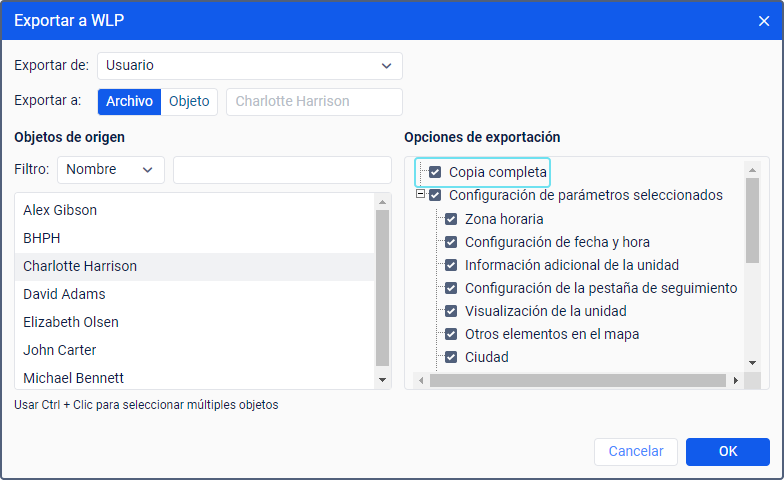 Para exportar parámetros, seleccione el punto Exportar a WLP en el menú de usuario y, en la ventana que se ha abierto, indique Usuario en el campo Exportar de. Vea la guía detallada aquí.