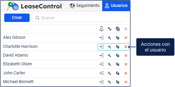 En la pestaña Usuarios se muestra la lista de todos los usuarios disponibles. Puede realizar las siguientes acciones con ellos: modificar o ver propiedades, copiar y eliminar. También puede crear nuevos usuarios y acceder al sistema como un usuario de la lista si usted tiene derechos de acceso. En la pestaña hay búsqueda dinámica por nombre de usuario.