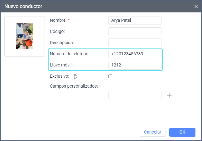 En las propiedades del conductor, rellene los campos Número de teléfono y Llave móvil.