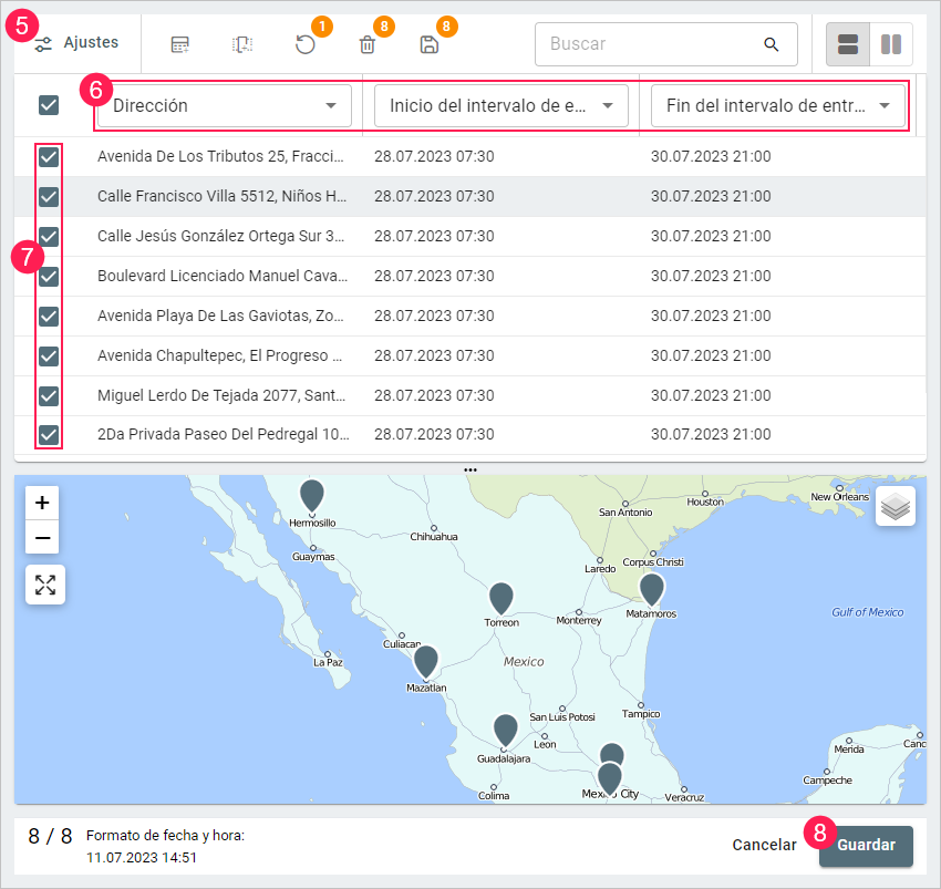 Después de hacer clic en Guardar, estos pedidos no se añaden a la página Planificación y permanecen en la tabla. Puede editarlos y eliminarlos, así como exportarlos a un archivo.