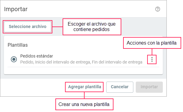Las plantillas de importación son encabezados de columnas que fueron guardados en una secuencia determinada. Son necesarias para no escoger manualmente los encabezados de columnas en la tabla durante la importación. Puede crear las plantillas en la ventana de elegir archivos para importar (botón Agregar plantilla) o en la siguiente etapa de importación en la tabla (icono