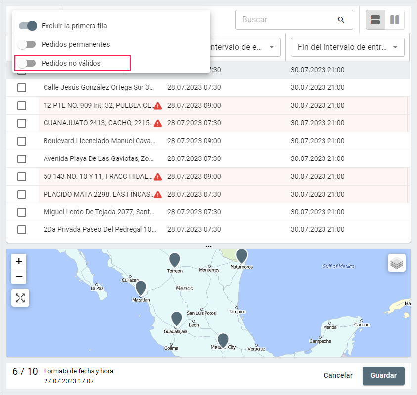 . Para mostrar en la tabla sólo los pedidos con valores no válidos, active el filtro Pedidos no válidos en los ajustes de la parte superior izquierda de la tabla.