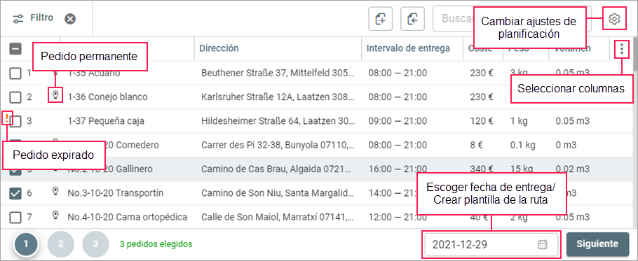 En la primera etapa de planificación, es necesario seleccionar los pedidos para planificar una ruta o rutas del día.