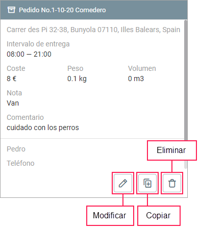 Con los botones en el rincón inferior derecho puede modificar los datos del pedido, copiar o eliminarlo.