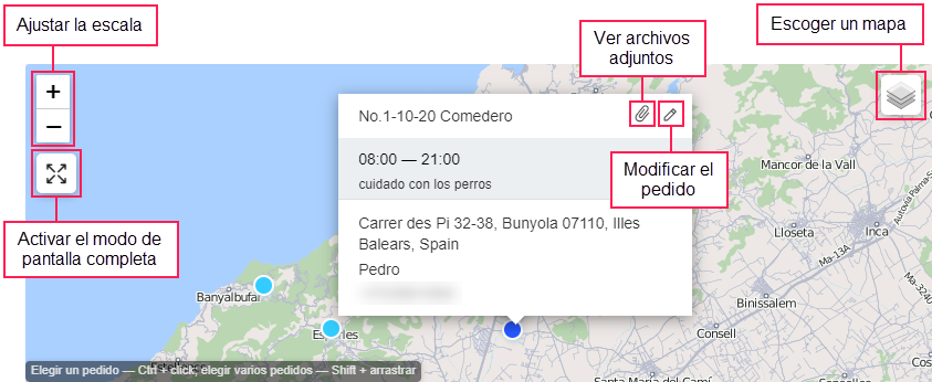 Asimismo, se puede seleccionar los pedidos en el mapa. Para hacerlo, haga clic en los marcadores de pedidos manteniendo presionada la tecla Ctrl; o, manteniendo presionada la tecla Shift, haga clic y arrastre el cursor para seleccionar el área dentro de la cual se encuentran los marcadores.