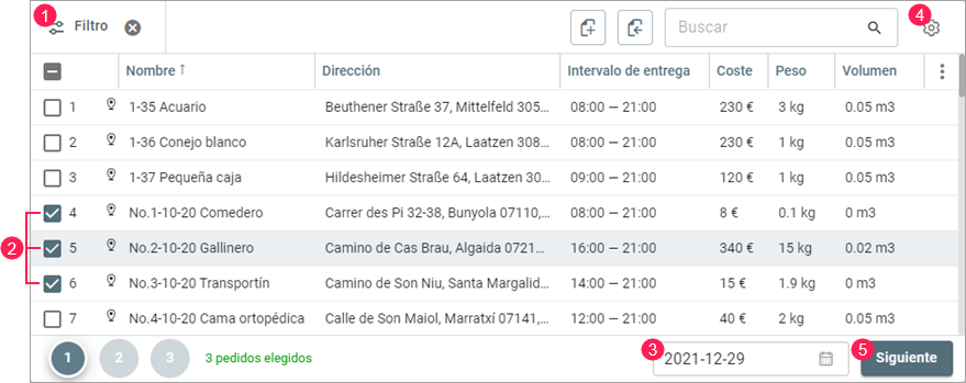 Si tiene seleccionados varios pedidos, en el bloque de información se muestran el peso, volumen, coste totales y cantidad de pedidos seleccionados.