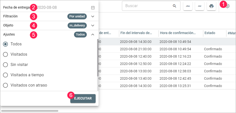 5. En el campo Ajustes, seleccione los pedidos que deben incluirse en el informe: todos, visitados, sin visitar, visitados a tiempo, visitados con atraso, confirmados, rechazados.