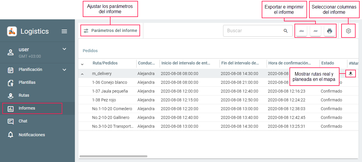 Haga clic en los enlaces para ver una descripción detallada de columnas disponibles en los informes de rutas, de rutas y pedidos y en el bloque Estadísticas.