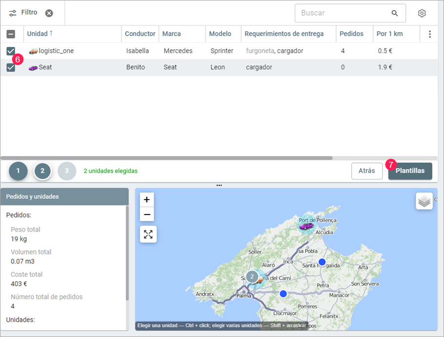En esta página están disponibles las plantillas para crear rutas. Se puede usarlas si se necesita crear rutas similares con regularidad. Una plantilla almacena información sobre los puntos de ruta y la unidad asignada.