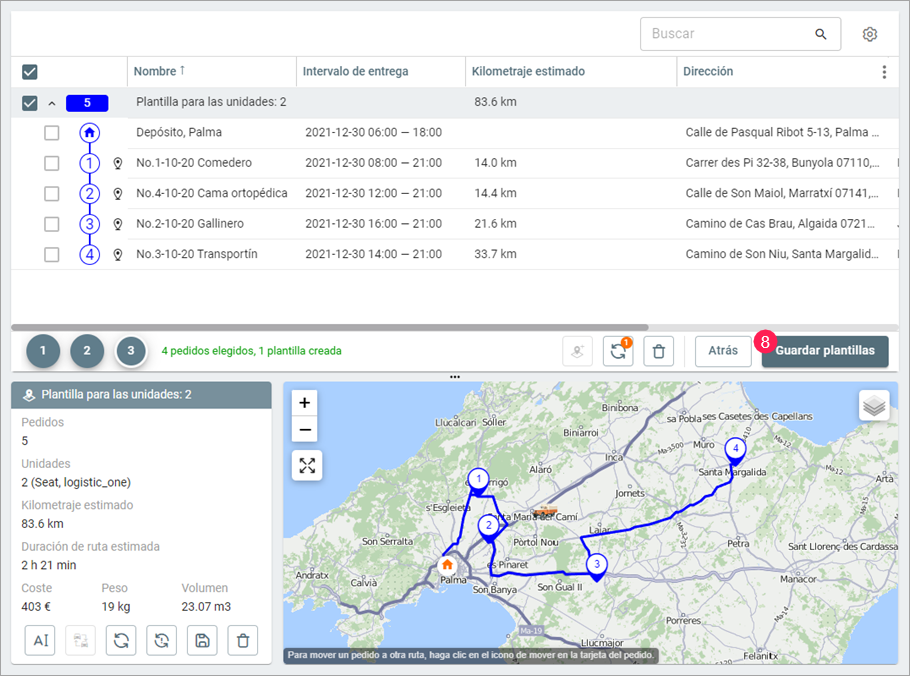 Para crear una ruta a base de una plantilla, selecciónela en la tabla, escoja la fecha de entrega y apriete el botón Iniciar rutas. Después, la ruta aparecerá en la página Rutas entre las rutas planeadas o activas.