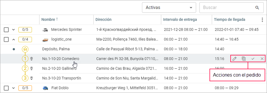 Al apuntar con el cursor a la línea de un pedido no realizado de rutas activas o planificadas, están disponibles las siguientes acciones: