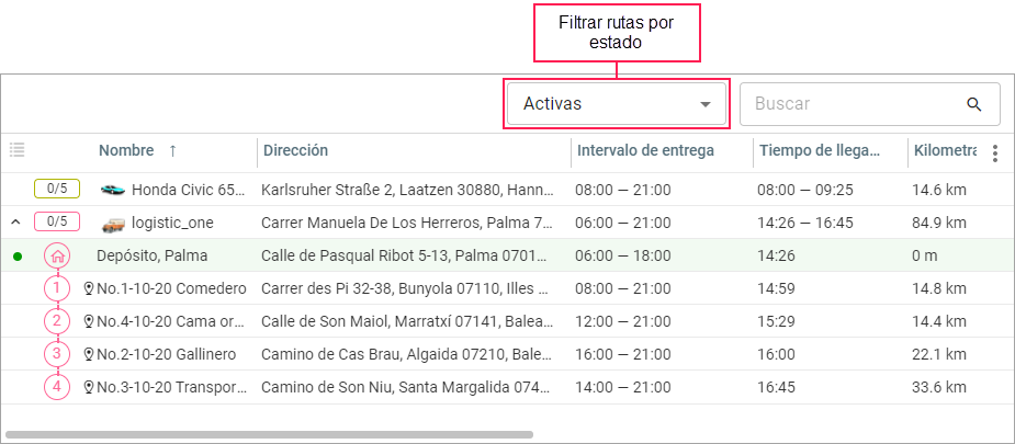 En la tabla de rutas se muestran las rutas cuyo estado corresponde al seleccionado en el filtro, y los pedidos que forman parte de las mismas. Para expandir o colapsar la lista de pedidos de la ruta, utilice los iconos