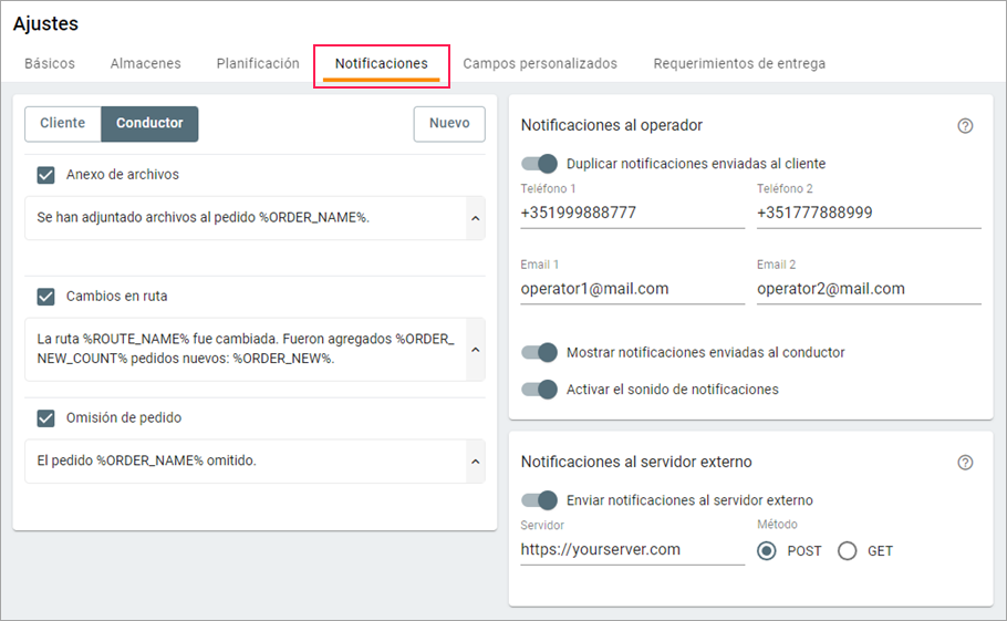 También en esta pestaña se encuentran los ajustes para enviar notificaciones al servidor externo.