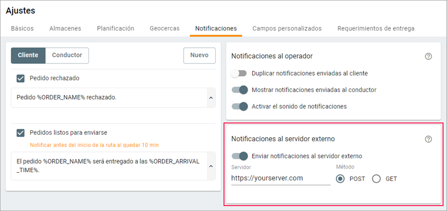En esta sección se encuentran los ajustes para enviar notificaciones a un servidor externo. Se pueden usar si integra Logistics con sistemas de terceros.