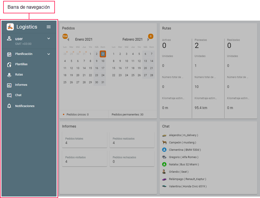 Usando la barra de navegación se puede pasar a diferentes páginas de la aplicación, abrir la documentación, cerrar la sesión, ver las últimas notificaciones.