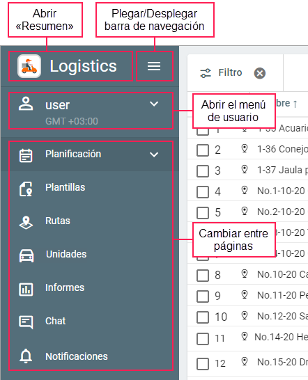 En la parte superior de la barra de navegación está el logotipo de la aplicación. Una vez apretado, se abre la página Resumen. Por defecto, esta página también se muestra una vez entrado en la aplicación.