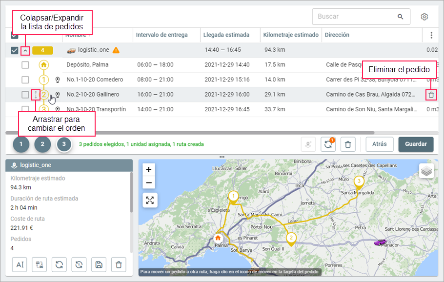 Para expandir la línea de la ruta y ver los pedidos de los que esta se compone, utilice el icono