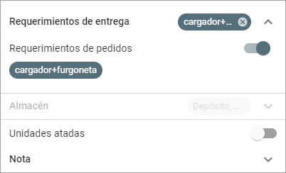 | Requerimientos de entrega | Es el filtro por requerimientos de entrega que están indicados en los parámetros del pedido y en la ventana de modificación de propiedades de la unidad. Por defecto, en el filtro están escogidos todos los requerimientos que están indicados en los pedidos. Si un pedido tiene varios requerimientos, estos se muestran dentro de una etiqueta. En la tabla están disponibles solo aquellas unidades que cumplen con todos los requerimientos a la vez. |