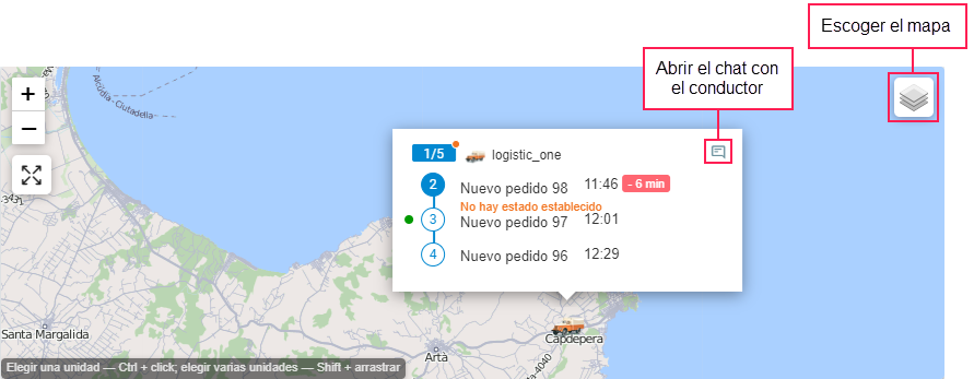 Después de hacer clic en la unidad, se muestra el nombre de unidad y el icono para ir al chat con el conductor asignado a la unidad. Asimismo, en un rectángulo coloreado se muestra el número de pedidos ejecutados y planeados para esta unidad.
