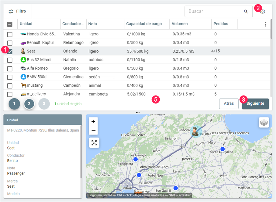 Antes de seleccionar unidades, en el mapa se muestran con los marcadores direcciones de entregas y unidades.