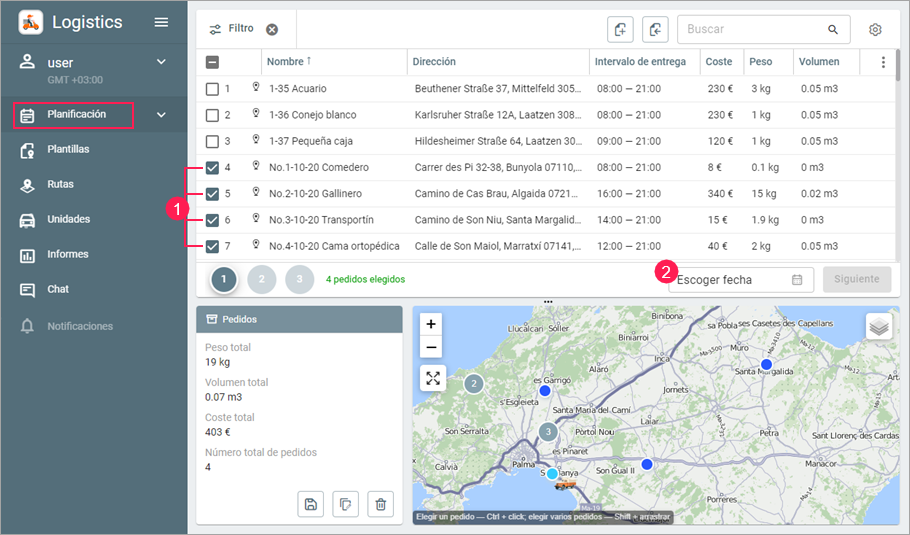Para crear una ruta a base de una plantilla, selecciónela en la tabla, escoja la fecha de entrega y apriete el botón Iniciar rutas. Después, la ruta aparecerá en la página Rutas entre las rutas planeadas o activas.